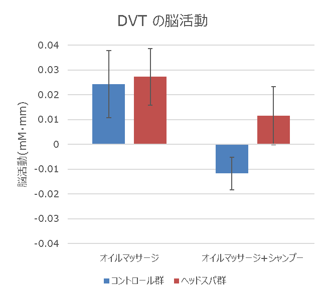 オイルマッサージ⇒シャンプー終了後の認知課題で、コントロール群に比べ、ヘッドキュア群の脳活動(左背外側前頭前野の血流量変化)が上る傾向が見られました。