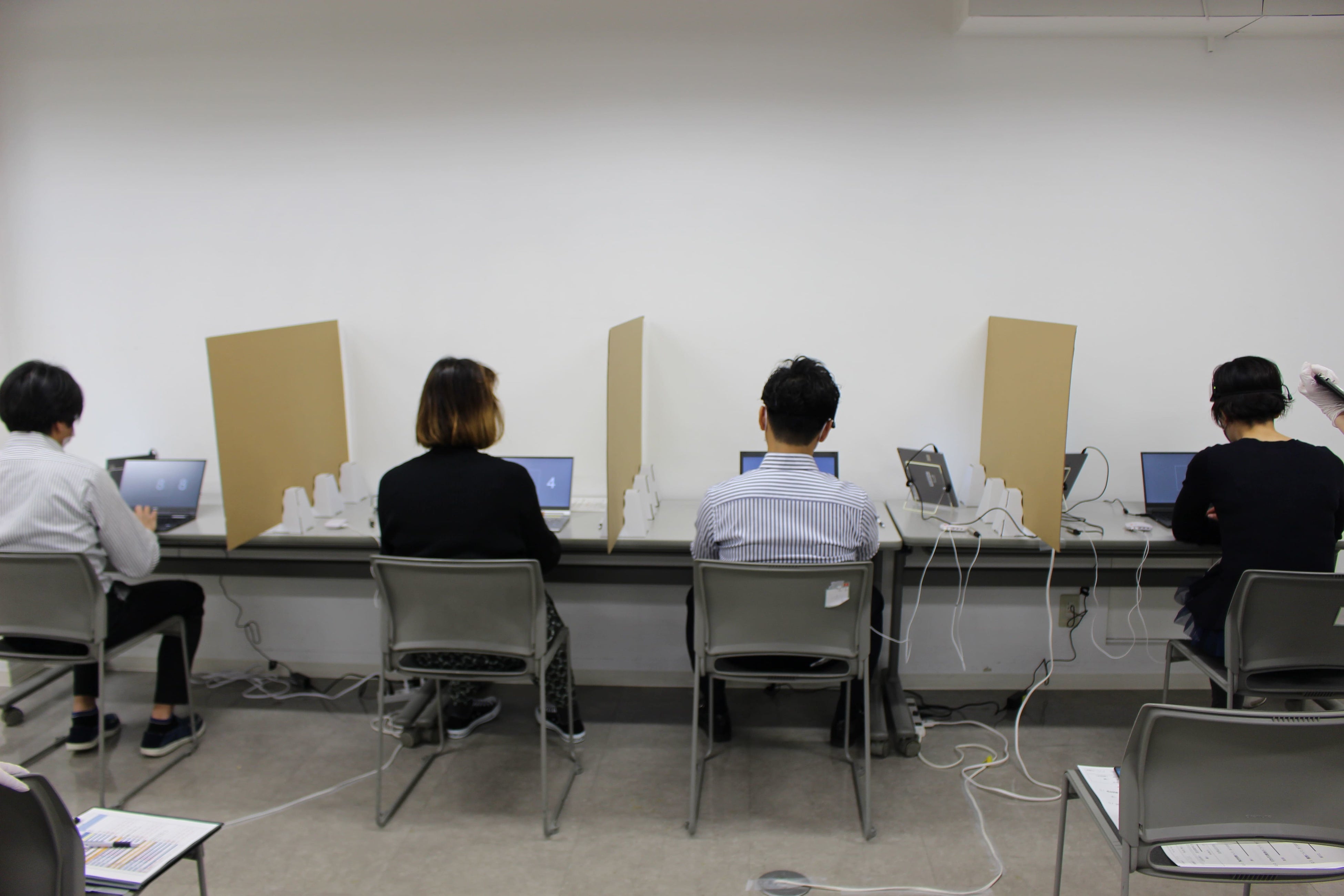 1.認知課題は4名同時に実施し、被験者間は互いに隣の人が⾒えない様に衝⽴で仕切りました。