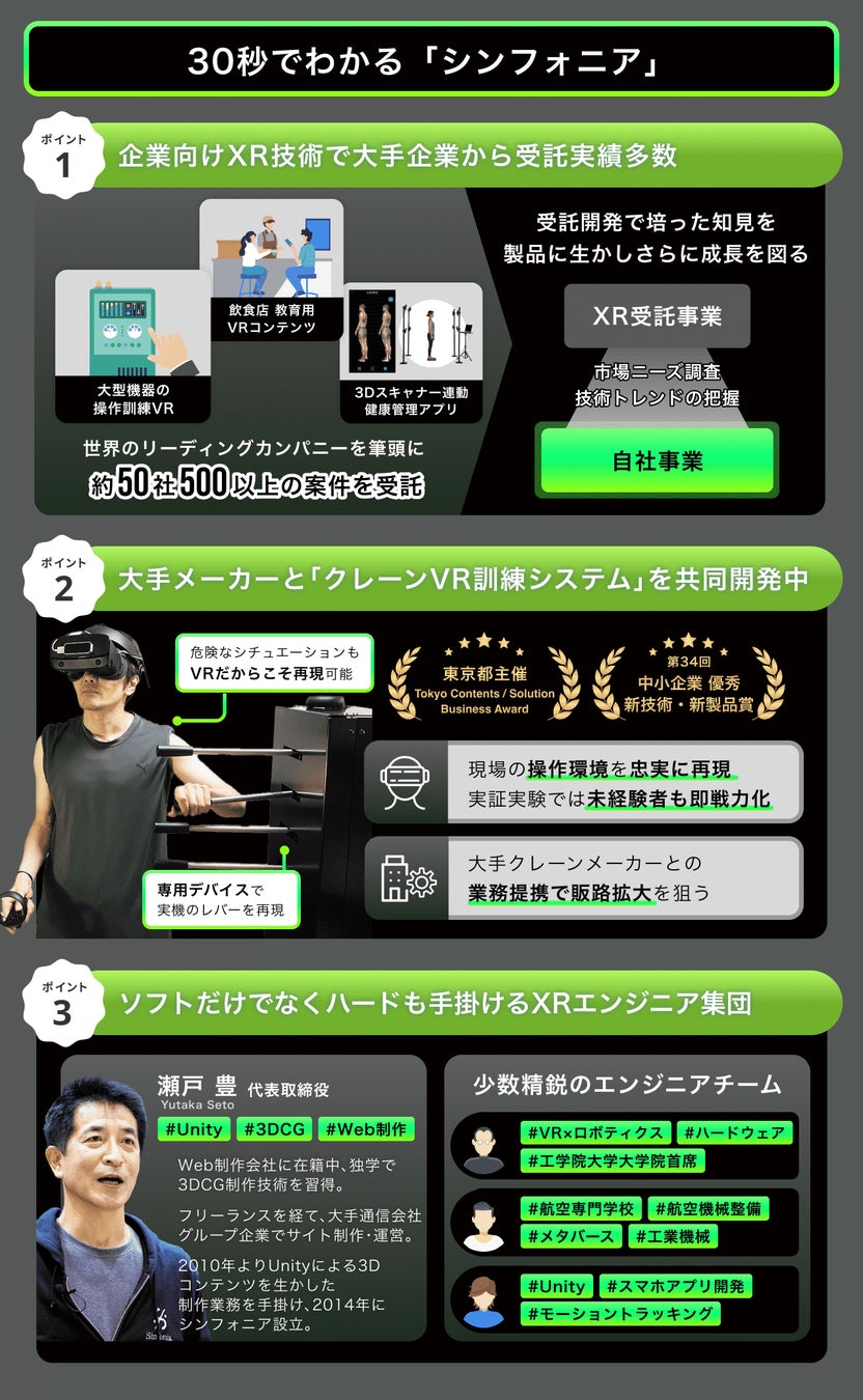シンフォニアは、仮想現実(VR)や拡張現実(AR)などクロスリアリティ(XR)技術を活用した人材育成のトレーニングコンテンツを開発し、人材不足の解決・早期戦力化を目指すスタートアップです。