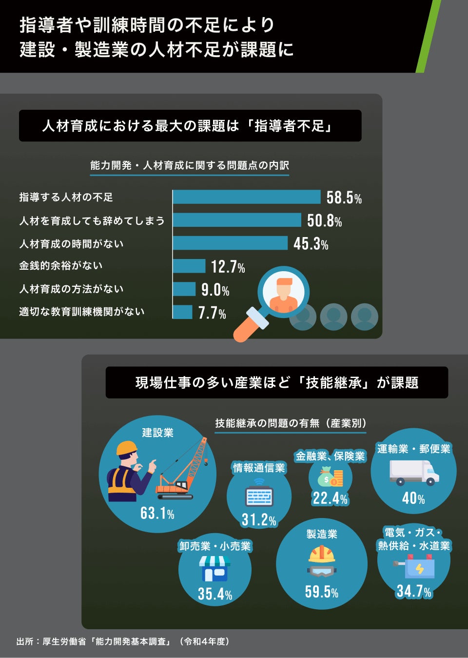 高齢化が進む中で指導者不足も課題となっており、即戦力となる人材の不足が深刻化しています。厚生労働省の能力開発基本調査(令和4年度)では、「技能継承に問題がある」とする事業所の平均が約40%だったのに対し、現場仕事の多い建設業や製造業では約60%になっています。