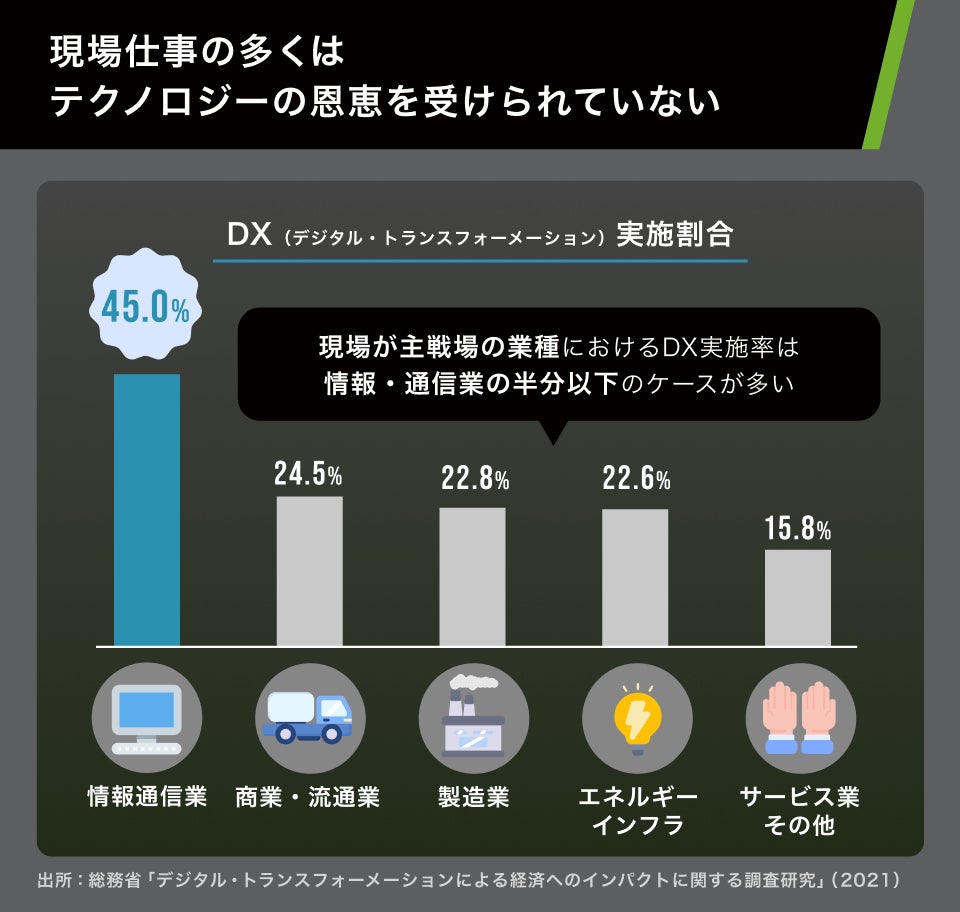 近年、デスクワークではDX(デジタル・トランスフォーメーション)や働き方改革による効率化と生産性の向上が進んでいます。しかし、建設・製造業や医療、教育、サービス業など現場で働く労働者は物理的な作業が求められるため、テクノロジーの恩恵を十分に受けられていないのが現状です。