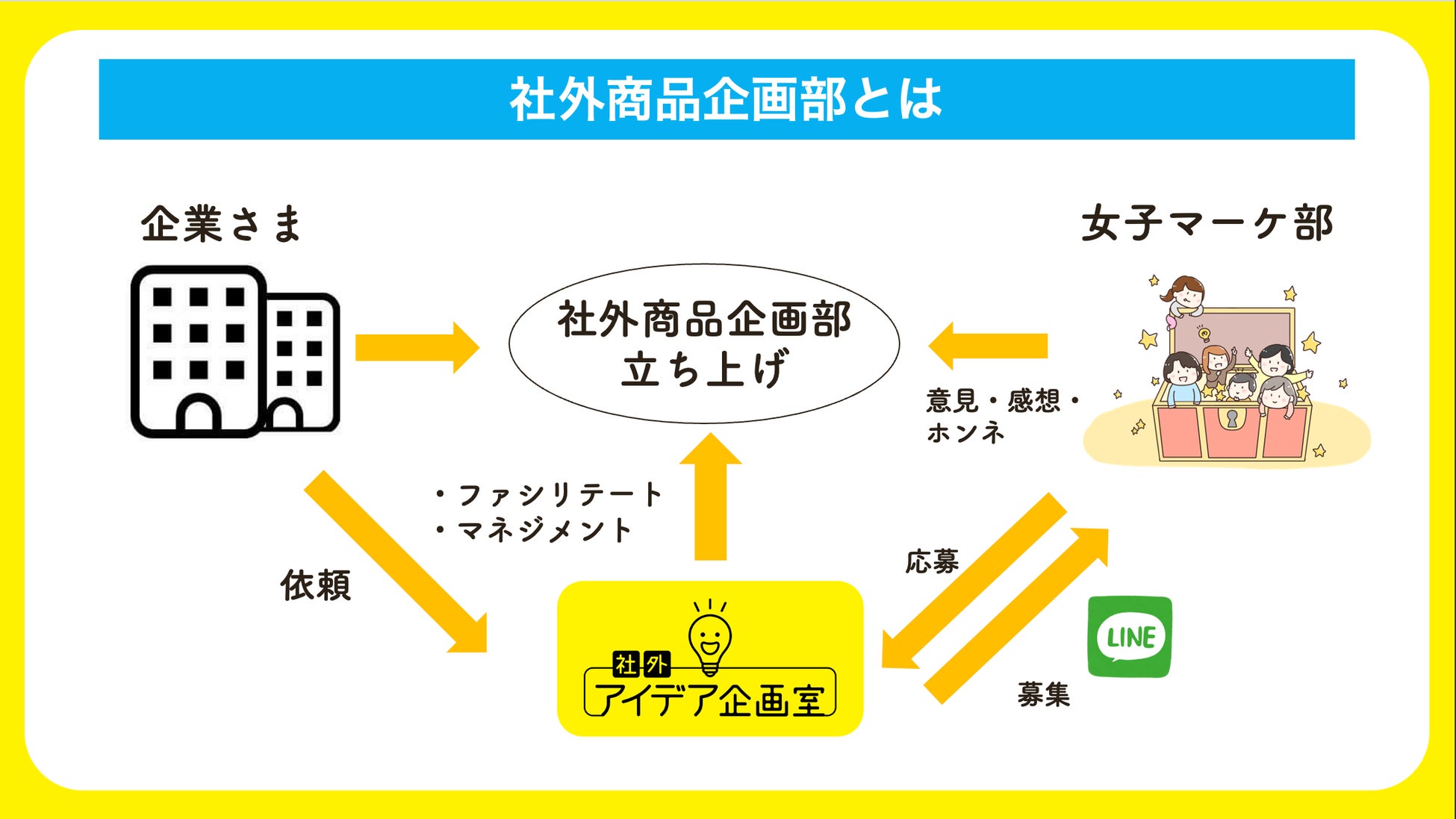 なお社外アイデア企画室株式会社は、商品開発を行う企業様と女子マーケ部メンバーと共に「社外商品企画部」というプロジェクトを通して新商品の企画開発を支援しております。
