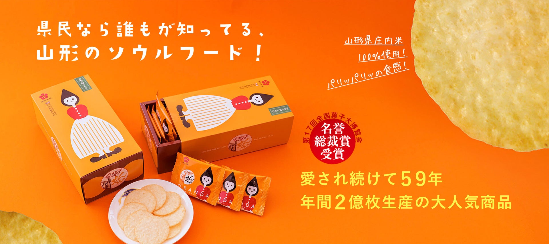 山形県庄内産のうるち米をわずか3mmの極薄に焼き上げた、元祖うす焼きせんべい。昭和37年の発売以来、販売店は東北のみにも関わらず年間2億枚生産している当社の代表商品です。現在は、地域限定商品やプレミアム商品の販売、また、海外での販売もスタートするなど、伝統を守りながらも時代とともに進化しつづけています。