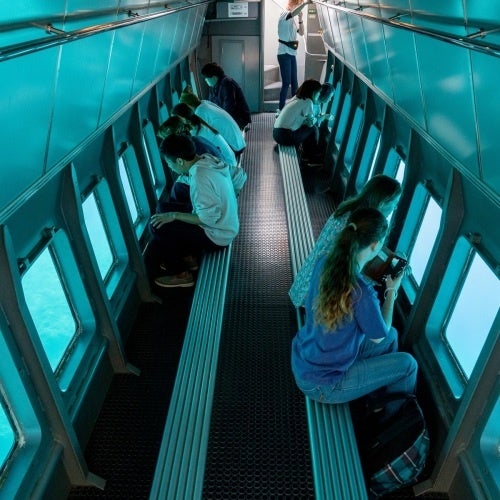 船上からの景色だけでなく、透き通った海を泳ぐ魚やゆらめく海藻、夜には夜光虫によってできた「海の天の川」といった海中の景色もお楽しみいただけます。所要時間は日中が約50分、夜間が約35分で、出航時間は不定期です。運が良ければイルカに出会えるかもしれません。