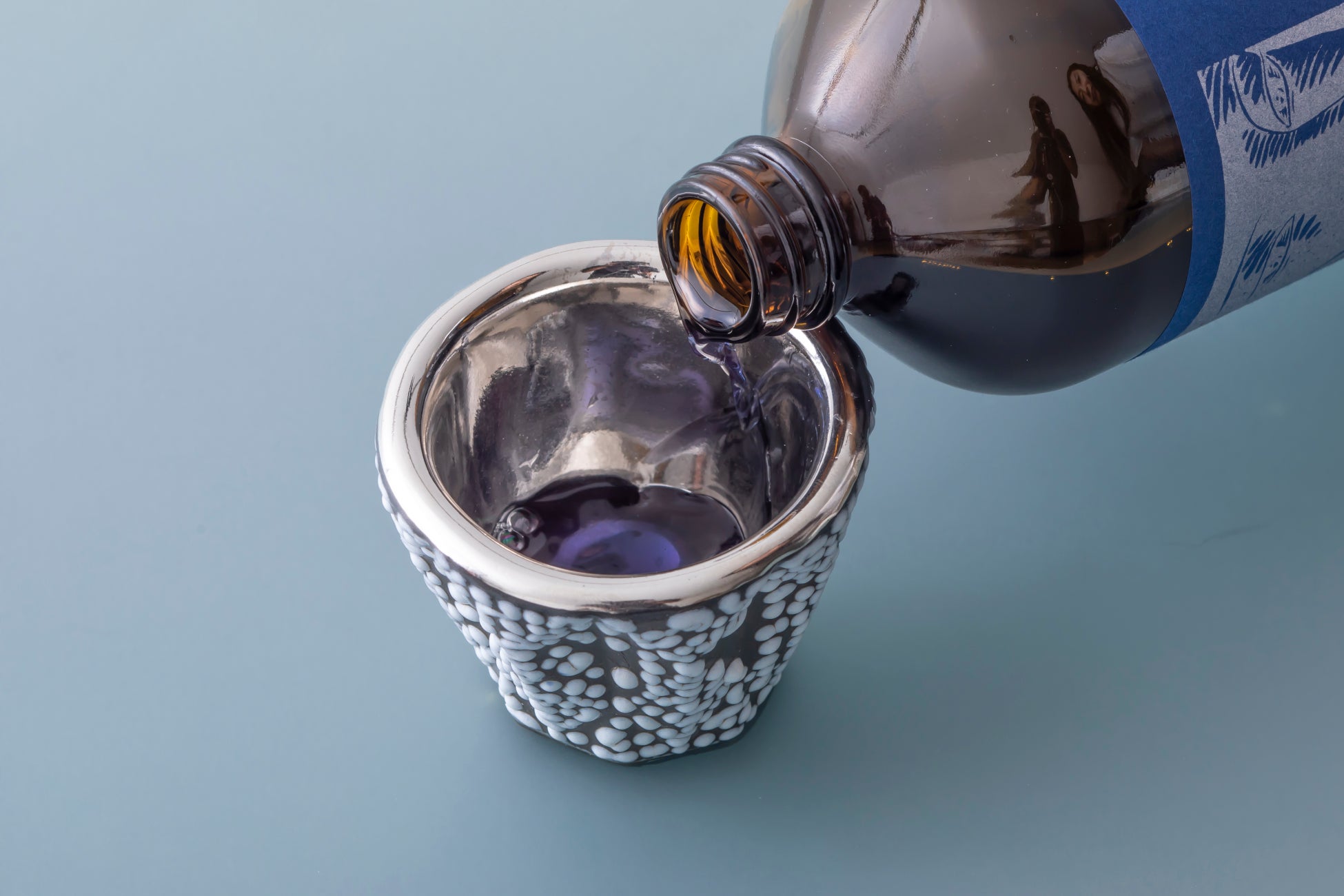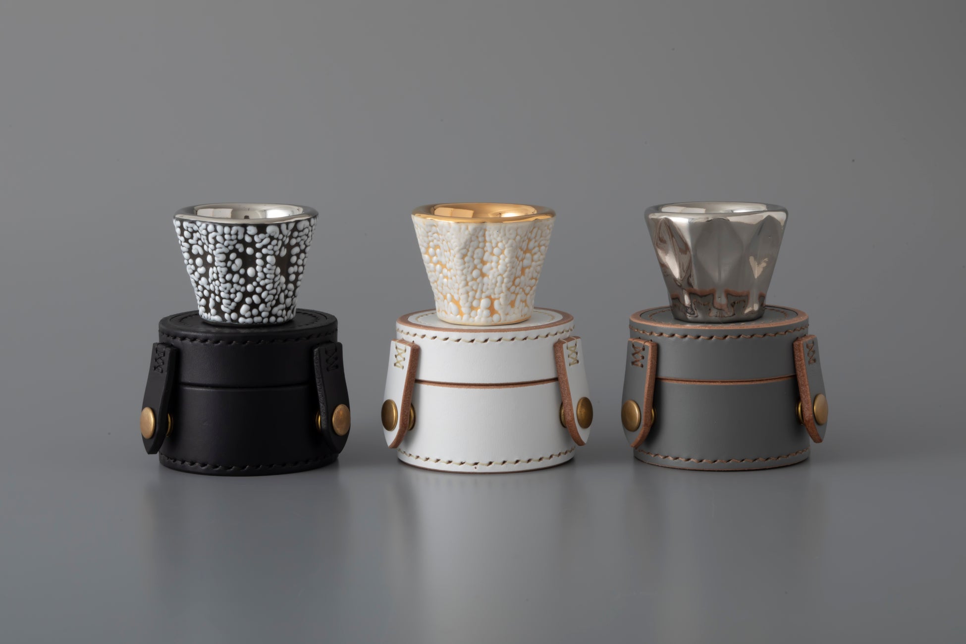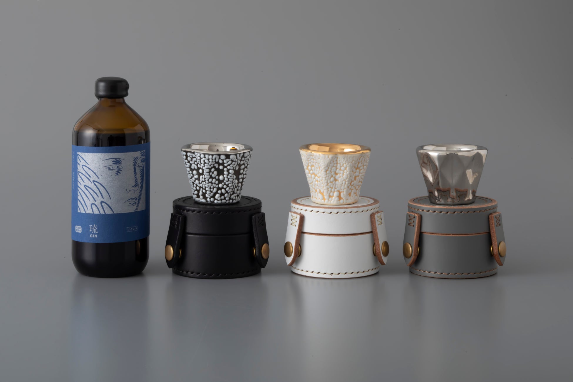 陶芸家 今村能章氏による 「S-presso Cup」は、琉GINをはじめ少量の蒸留酒をストレートやオンザロックで楽しむための器。今村氏の代表作でもある「Espresso Cup」をベースに、琉GINをイメージソースに3色の作品を制作していただきました。内側がシルバーの器を純白金を、ゴールドの器には純金を焼き付けて、口当たりの質感を高めています。常に愛用いただけるように持ち運びできる専用ケースも付属。