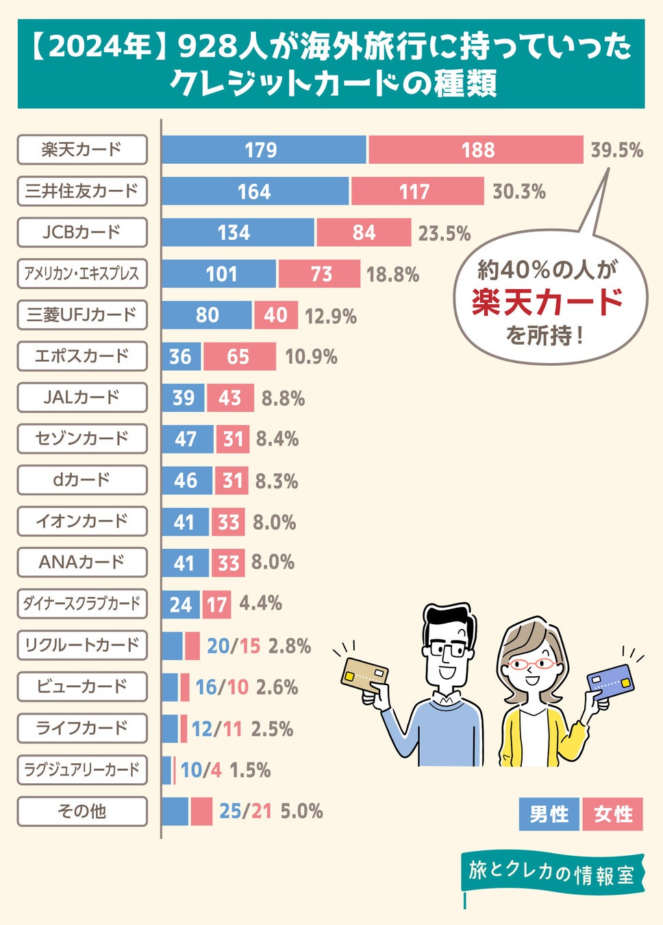 2024年に海外旅行に行った人に持っていったクレジットカードの種類をアンケートした結果、39.5%(369人)の人が楽天カードを所持していたことがわかりました。楽天カードは男女ともに所持している人が多く、日常的にも一般的で使いやすいことが要因だと推測されます。