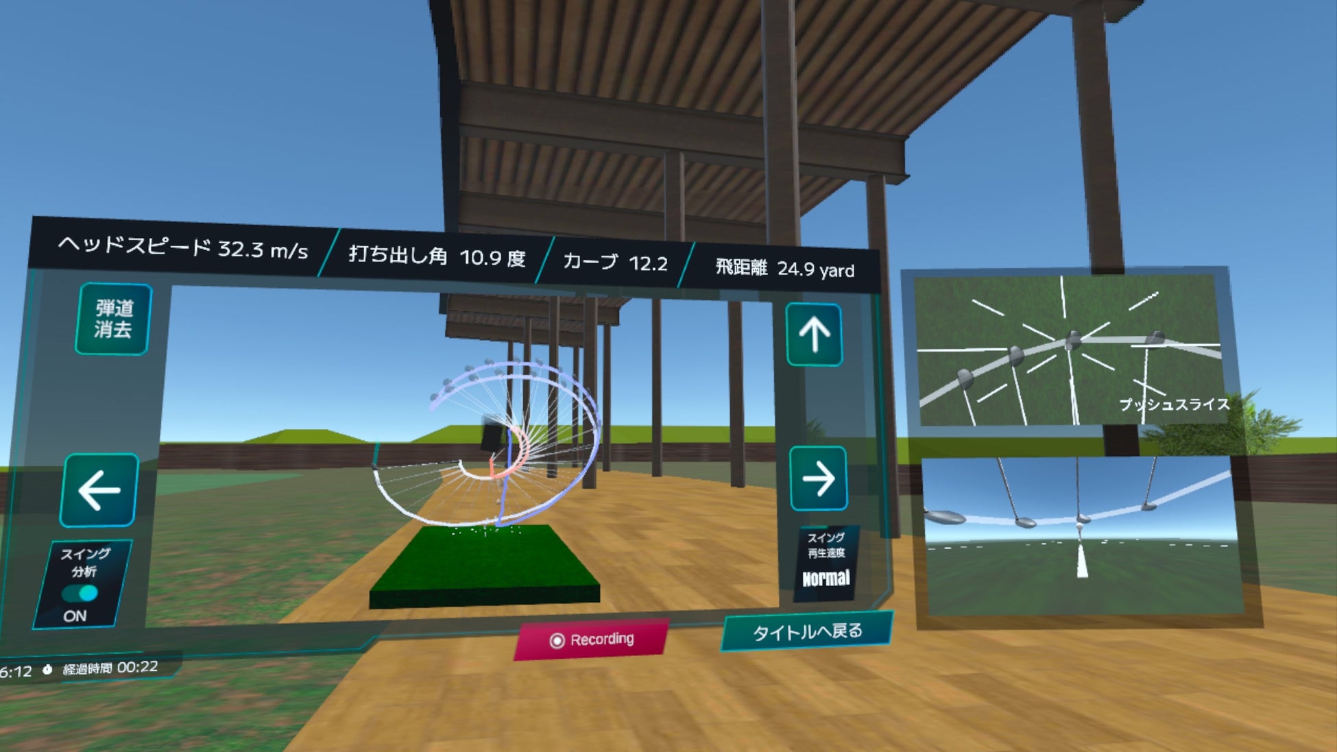 ドライビングレンジ(打ちっぱなし)をVRで再現。リアルタイムで弾道を確認しながら、以下のデータや機能を活用できます。