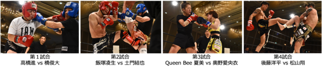 TEEさんと川嶋勝重さんによるエキシビションマッチを皮切りに始まったのが、本格的なキックボクシングの試合。第1試合は、両者ともにバンゲリングベイ所属の高橋進選手と山橋俊大選手が対戦し山橋選手が判定で勝利。第2試合は飯塚凌生選手(K-1ジム五反田)と土門結也選手(バンゲリングベイ)が対戦し、判定でドロー。