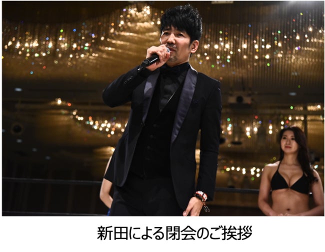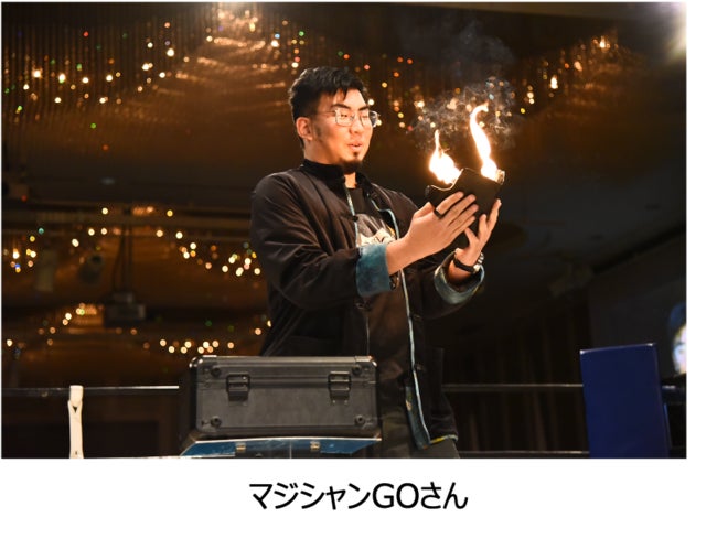 代表・新田からの「キックボクシングのフィットネスジムの第一人者という自負がある」というあいさつに続き、イベントのオープニングを飾ったのは、「これが運命です!」の決め台詞で知られるマジシャン、GOによるマジックショー。新田とともにリングに上ったGOさんは、トランプマジックやお札マジックを次々と披露。続いて、K-1でも活躍した空手家のニコラス・ペタスさんによる乾杯の音頭で一夜限りの祭典は華々しくスタート。