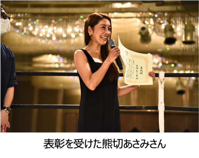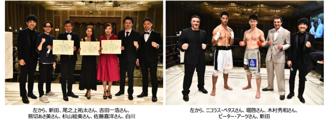 続いてリングに上がったのは、女優の熊切あさ美さん、実業家の杉山絵美さん、テレビ番組「月曜から夜ふかし」を手掛ける株式会社モスキートの吉田一浩さんと尾之上祐太さん。一般社団法人日本キックボクシング選手協会の代表理事、佐藤嘉洋さんからそれぞれに、キックボクシングフィットネスの安心・安全な魅力を広げ、新興に多大な貢献をした方として感謝状が贈呈されました。続いて、トレーナー・白川裕規から、バンゲにおけるキックボクシングフィットネスのトレーニング方法を体系化した「バンゲメソッド」についても発表されました。