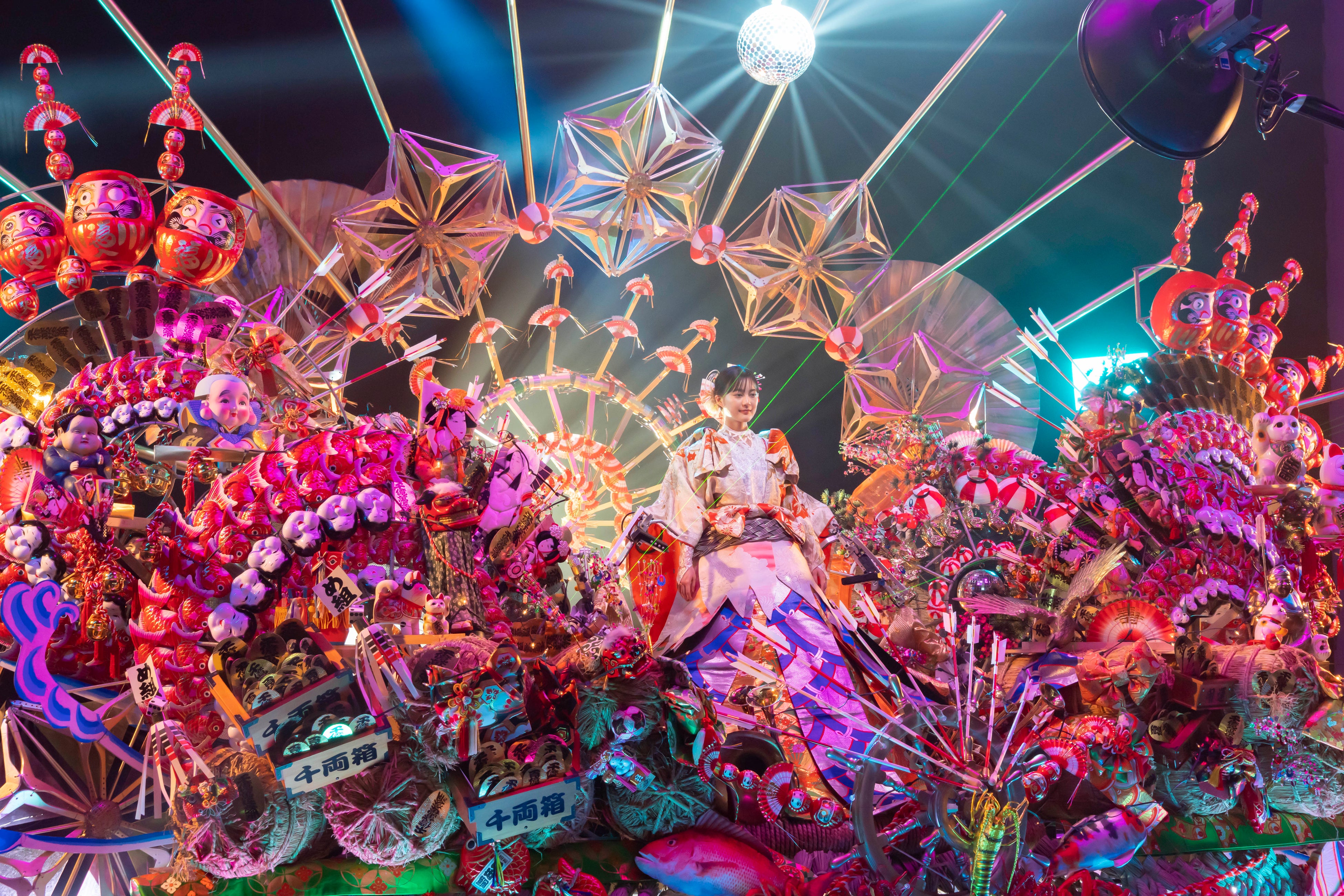 巨大な衣を構成するのは、熊手などに使われる縁起物。
