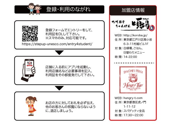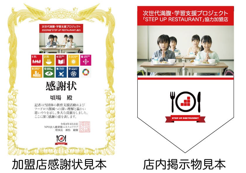 本件は、子ども達の学習意欲向上と飲食店におけるフードロス削減を目的に企画されたプロジェクトです。食事付き無料自習室ステップアップ塾の塾生はもちろん、所得証明を提出した小・中学生の利用希望者を対象に、専用アプリで発行されたスマホ証明書を店舗スタッフに提示をすることで、加盟飲食店の指定する食事を無料で受けられる社会貢献サービスです。加盟店側は、通常メニューに加えて「まかない飯」など、フードロス削減を意識したメニューを提供することで、SDGsを意識した飲食店として社会貢献が可能となります。