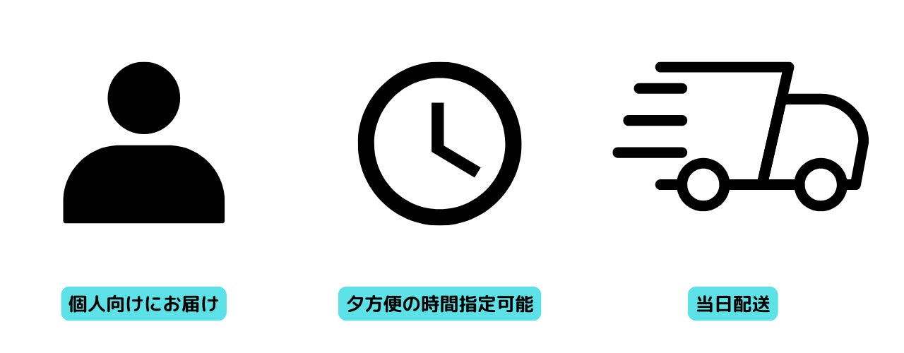 個人のお客様・業務用のお客様へ当日配送: 一般のお客様も豊洲/築地の商品を当日受け取り可能で、東京都内では最高鮮度の鮮魚類が購入できます。業務用の当日配送サービスは他にもいくつかありますが、個人向けかつ柔軟な時間指定が可能な画期的なサービスです