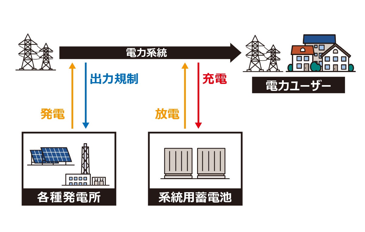 系統用蓄電池は、電力系統に直接連系する大規模な蓄電設備です。系統から電力を充電し、需給状況に応じて放電することで、電力バランスの安定化に寄与します。