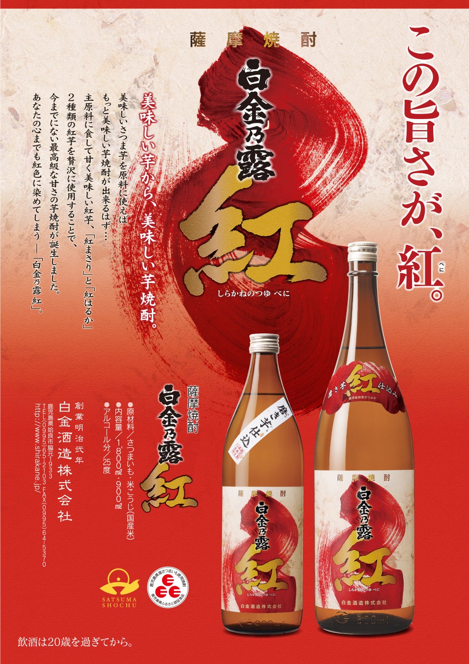 食べてこんなに美味しい芋なら、焼酎にしたらもっと美味しい焼酎が出来るに違いない!ということで出来たのが「白金乃露紅」です。鼻から抜けるフルーティな香りとえぐみの無いすっきりとした味わいは
