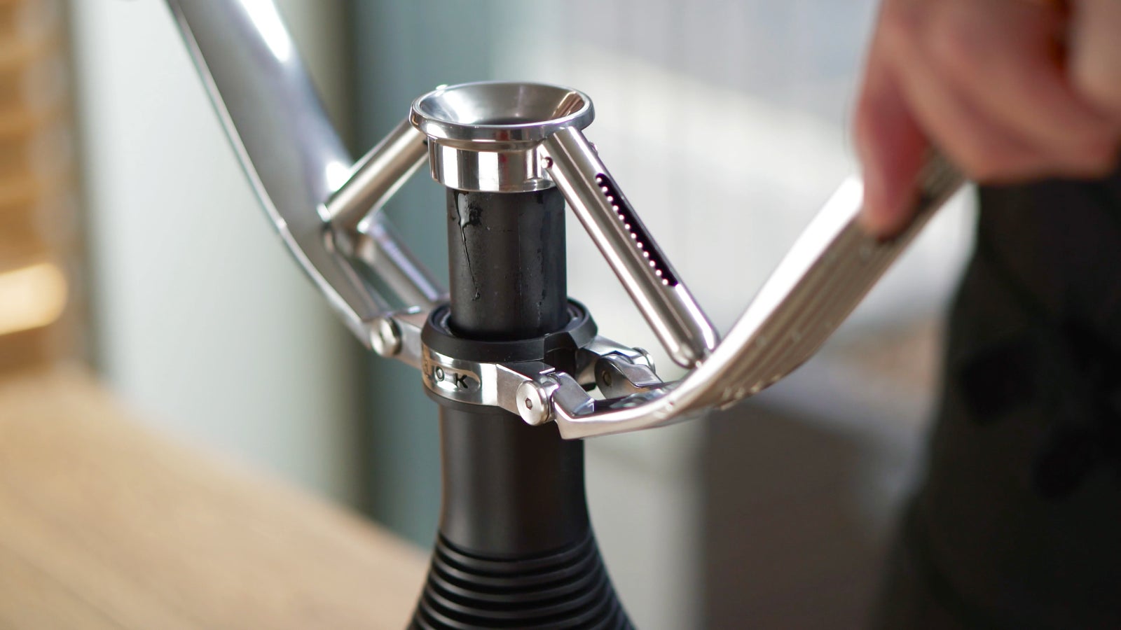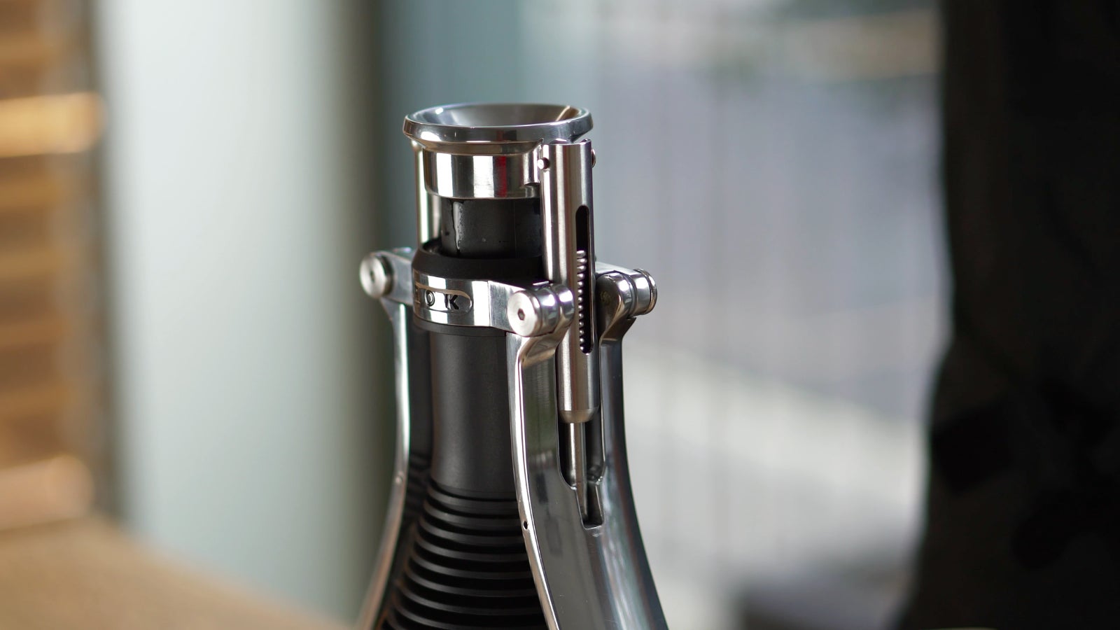 非電動でエスプレッソを抽出する事にこだわり続けたこのブランドの新製品は、一旦レバーを押し下げるとその後はハンドルに固定されたスプリングがピストンを引き下げ続け、自動的にチャンバー内の圧力と抽出時間を一定に保つ。