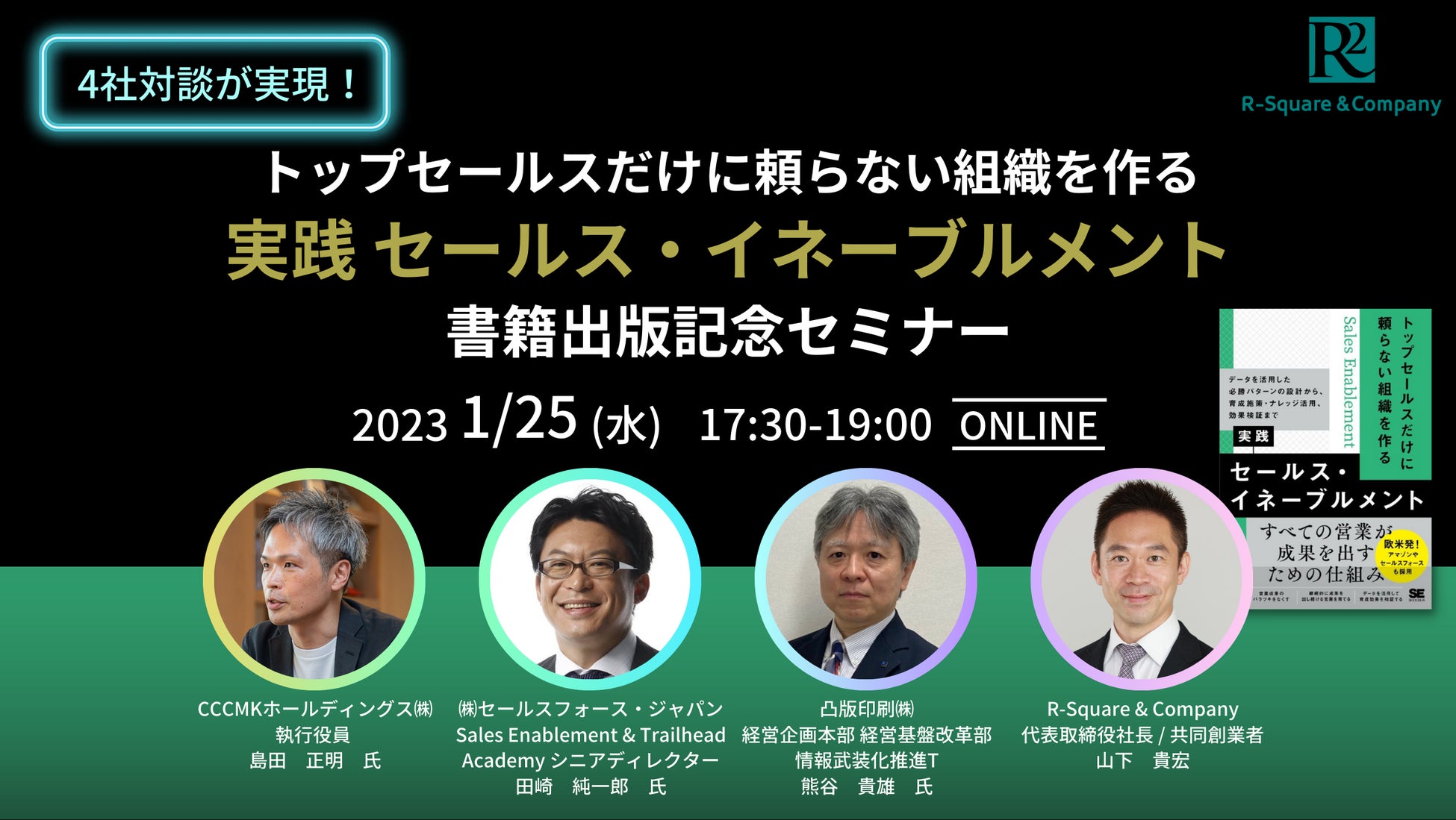 株式会社アールスクエア・アンド・カンパニー(本社:東京都千代田区、代表取締役社長:山下貴宏)は、代表取締役社長・山下貴宏の2作目の著書『トップセールスだけに頼らない組織を作る 実践セールス・イネーブルメント』の出版記念セミナーを、2023年1月25日(水)にオンライン開催することをお知らせいたします。