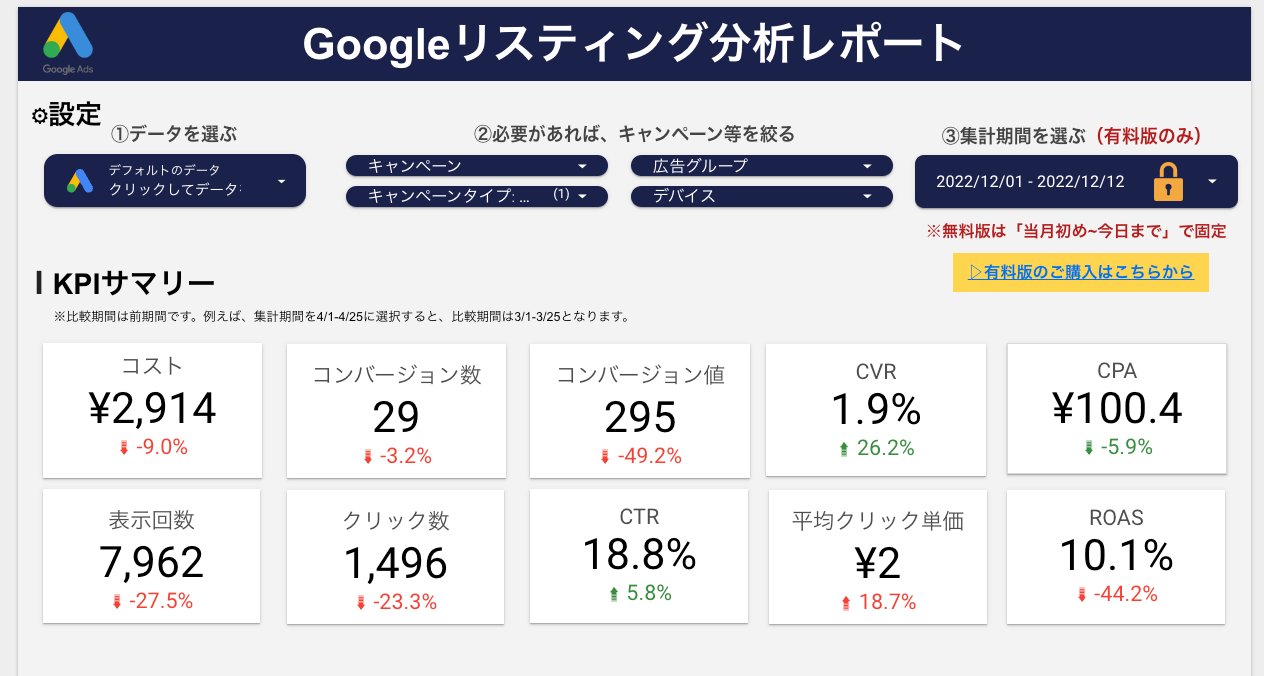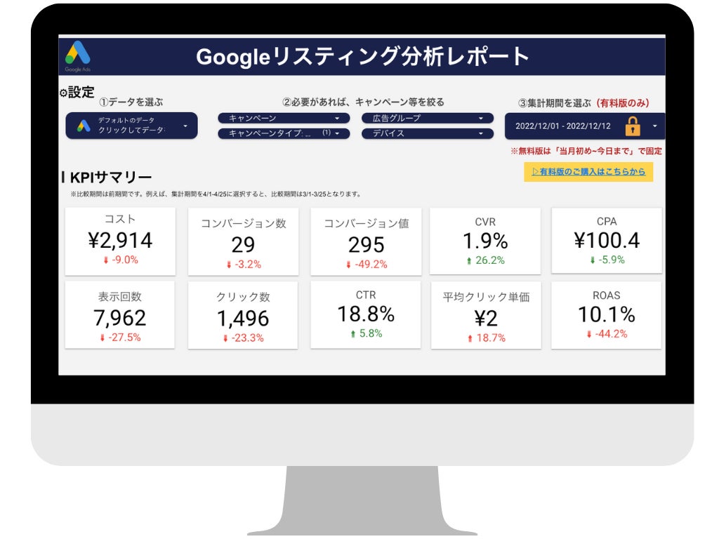 そこで、分析の時間がない方や初心者の方でも分析ができるように、Googleリスティング広告の改善点がひと目でわかる、分析レポートを無料で公開いたします。