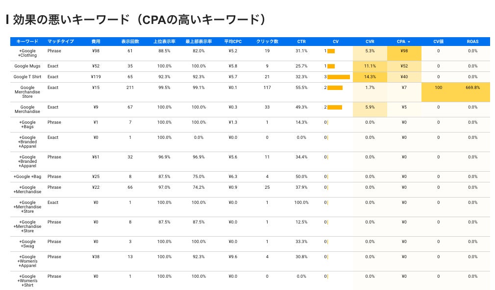 ③効果の良いキーワードと、停止をした方が良い効果の悪いキーワードが一目でわかる