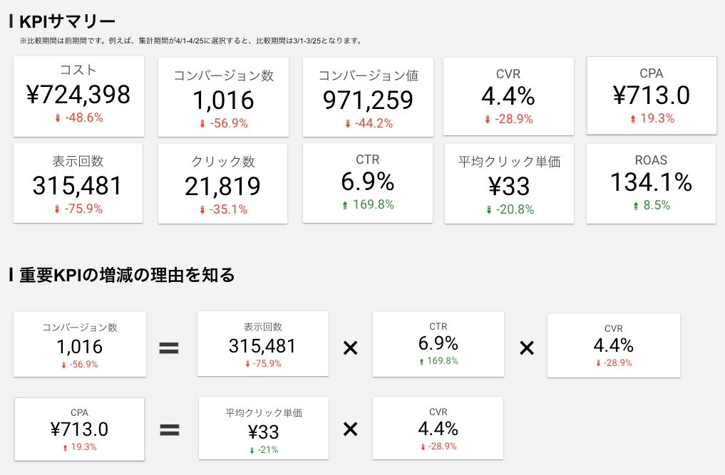 今回提供するレポートでは、レポートを開くとすぐに重要な指標が大きく表示されているので、サクッと重要な指標を確認することができます。