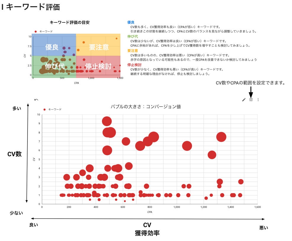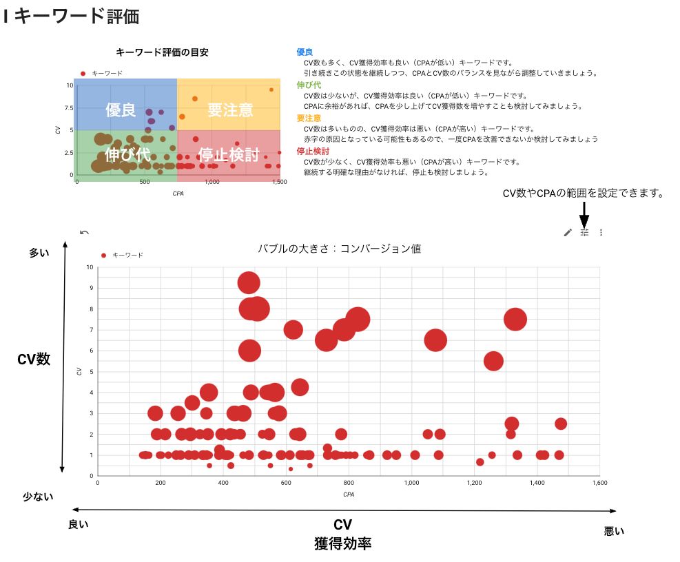 この4つのグループを元に、CV数を優先して伸ばしたいなら伸び代(左下)や優良(左上)に該当するキーワードの入札単価の調整や類似キーワードの入稿を優先して行うなどの優先度を決めることができます。