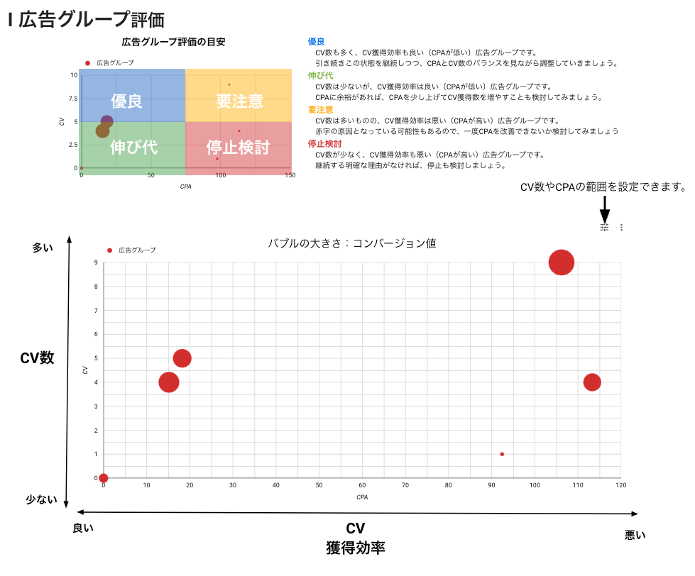 このように、グラフの位置によってざっくりと各キャンペーンの状態が把握できるので、各キャンペーン(広告グループ)の対応方法や優先度を考えつつ、ネクストアクションを決めることができます。