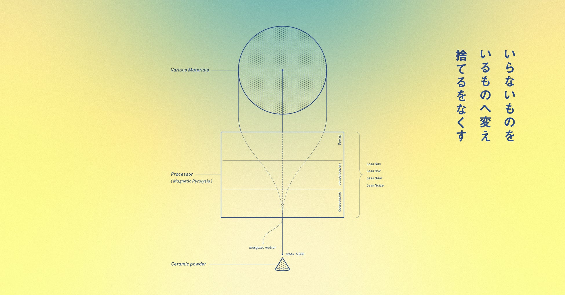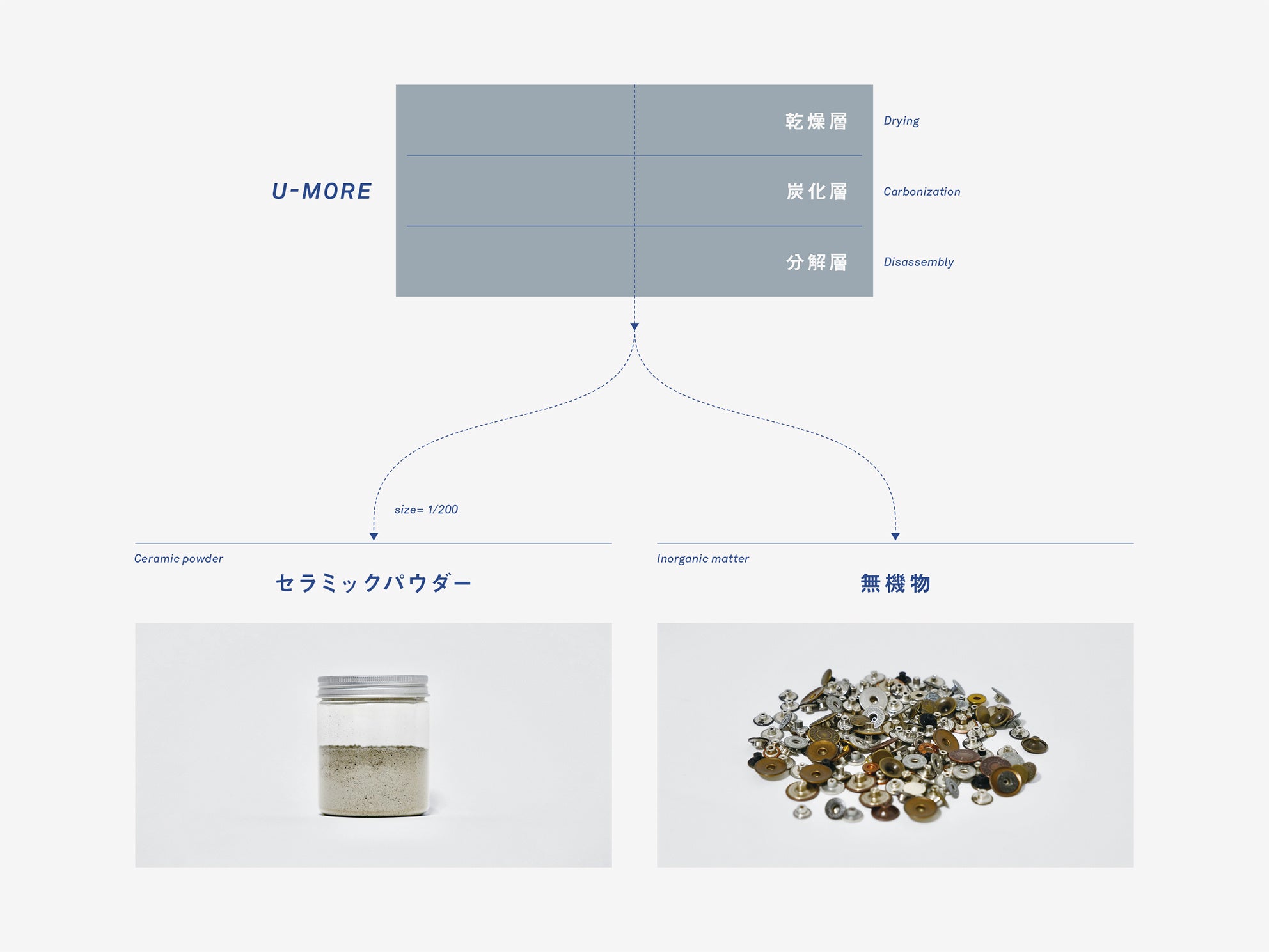 「U-MORE」は、磁力を応用し有機廃棄物を分解処理する装置です。 強い磁場を通した空気と熱を与えることにより、有機物の分子結合が弱くなり「燃焼」を伴わず、急速に酸化・分解が進みます。廃棄物を燃焼させないため、ダイオキシンやCO2、塩素ガスなどの発生量を、環境基準値を大きく下回る数値に抑えることができます。また分解後に生じるセラミックパウダーは、陶器やセメントの素材としての活用可能なほか、AddElm株式会社と協業した機能性繊維製品への活用や、3Dプリント製品の原材料としての活用など、多方面で研究開発を行っています。