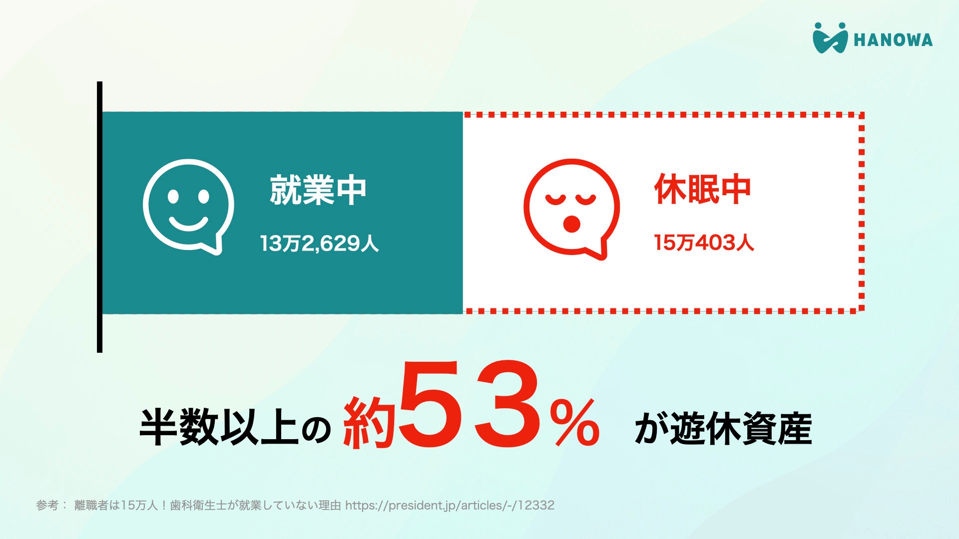 また、歯科衛生士のほぼ9割以上が女性であり、国家資格者およそ28万人の中で53%が離職してしまっている事実があります。彼女たちが再就職しづらい理由に出産や育児などで都合がつかない、働き方改革の遅れが人材不足に起因している側面もあります。HANOWAは、常勤でもパートでもない、第三の選択肢として日本で初めて歯科業界のギグワークを提唱した結果、サービススタート2年で安定成長してこの5月に実績として累計マッチング回数4,500回、累計流通人件費総額5,000万円を突破しました。