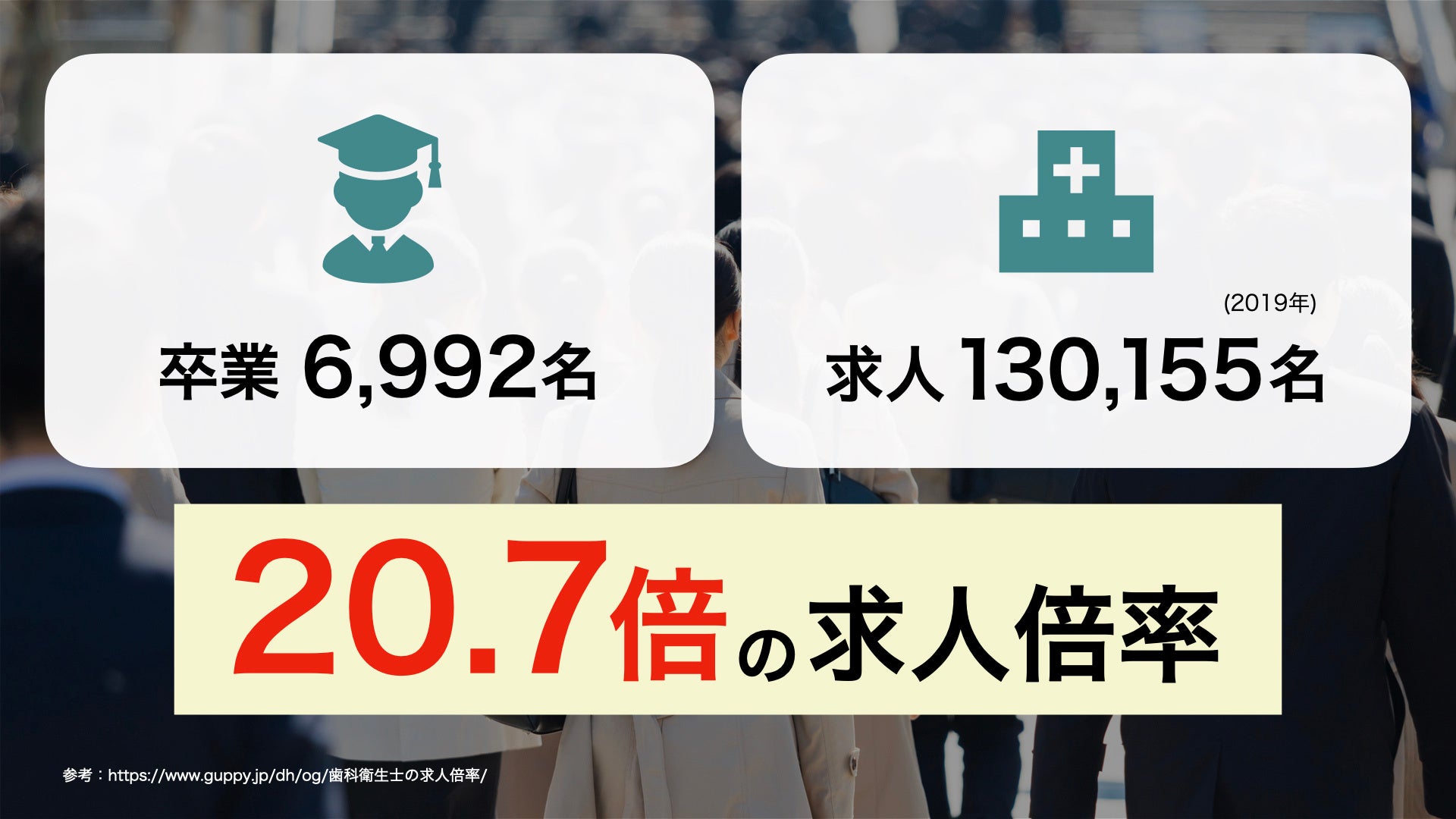 しかし日本で今後、歯科定期検診が普及する上で最も重要な人材は歯科衛生士です。冒頭にあげたように、新卒求人倍率およそ20.7倍、すなわちおよそ6,500名の専門学校卒業生たちに対して、13万人分の求人募集が殺到するのが我が国の現状です。