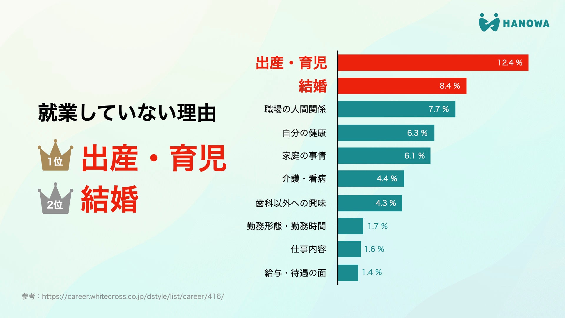 子育て支援を社会の共同活動と捉え、現役の子どもを持つ歯科医療従事者たちが憂いなく全力で働ける環境を整えることが求められると考えます。また、これから子どもを持つ可能性のある未来の歯科医療従事者たちも「この職業の未来には充実した保障があり、全力でスキルを磨く価値がある」と思える未来への信頼感を育てることが重要であると考えます。