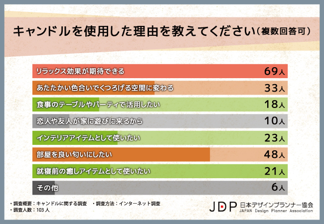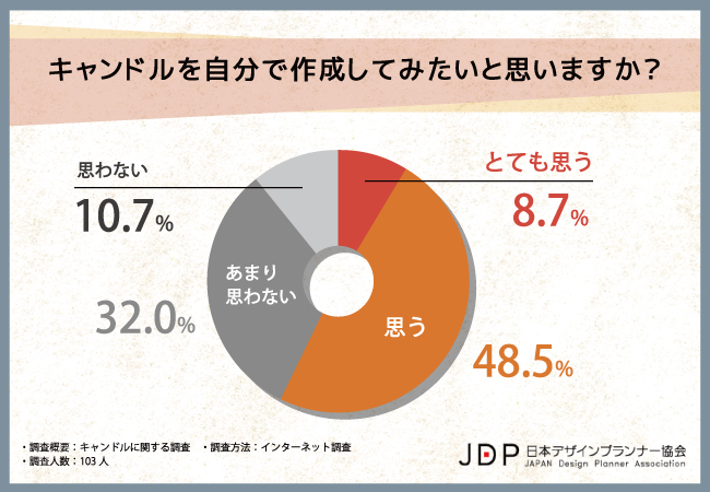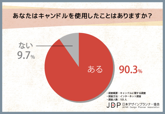 そこで今回、キャンドルデザイナー認定試験(https://www.designshikaku.net/handmade/candle/)を主催する日本デザインプランナー協会(https://www.designshikaku.net/)は、全国の男女103名を対象に「キャンドル」に関するアンケートを実施しました。