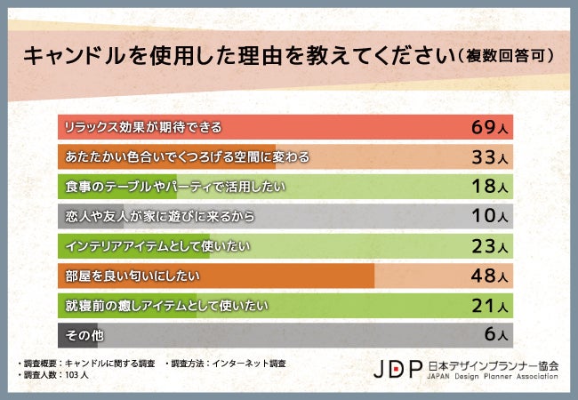 『リラックス効果が期待できる』と回答した方が69人、『部屋を良い匂いにしたい』が48人、『あたたかい色合いでくつろげる空間に変わる』が33人、『インテリアアイテムとして使いたい』が23人、『就寝前の癒しアイテムとして使いたい』が21人、『食事のテーブルやパーティーで活用したい』が18人、『恋人や友人が家に遊びに来るから』が10人、『その他』が6人
