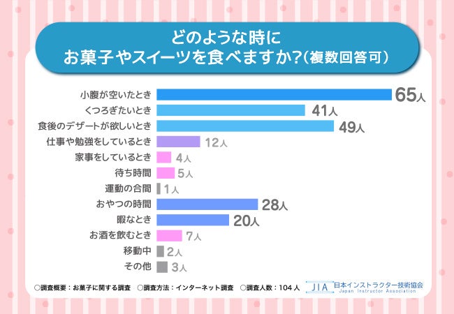 『小腹が空いたとき』(65人)が最も多く、次いで『食後のデザートが欲しいとき』(49人)、『くつろぎたいとき』(41人)、『おやつの時間』(28人)、『暇なとき』(20人)、『仕事や勉強をしているとき』(12人)、『お酒を飲むとき』(7人)、『待ち時間』(5人)、『家事をしているとき』(4人)、『移動中』(2人)、『運動の合間』(1人)、『その他』(3人)という結果になりました。