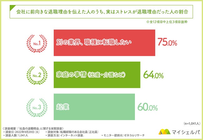 特に前向きな理由を伝えた方のうち、「別の業界・新しい職種に挑戦したい」と回答した方では75.0%、「家庭の事情(出産・介護など)」では64.0%、「起業」と回答した方では60.0%が、実は「ストレスが原因」で退職していたことが分かりました。