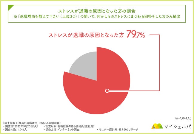 退職した理由について3つまで回答してもらったわけですが、その上位3つのうち1つでも「ストレス」に係わる回答を抽出してアンケート対象者の総数で集計したところ、実に79.7%と約8割が何らかのストレスが原因で退職していたことが分かりました。