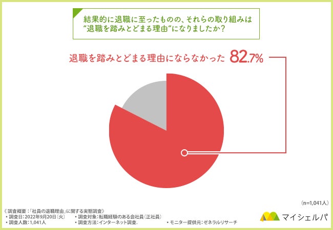 そこで、「結果的に退職に至ったものの、それらの取り組みは“退職を踏みとどまる理由”になりましたか?」と質問したところ、『ある程度はなった(何度か思いとどまった)(17.3%)』『どちらともいえない(一度は思いとどまった)(26.1%)』『まったくならなかった(思いとどまることはなかった)(56.6%)』という回答結果になりました。