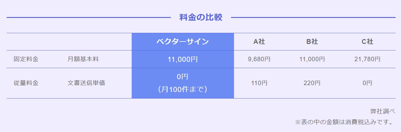 「契約先に合わせて複数の電子署名サービスに加入する」ことなど、契約数の多い大手企業であっても躊躇するはずです。「契約もテレワークで済ませたいけど、とにかく電子署名サービスは高いし、料金プランが複雑だ」──そんな悩みを「ベクターサイン」が解決します。「ベクターサイン」には月額基本料に100件分までの送信料が含まれています。