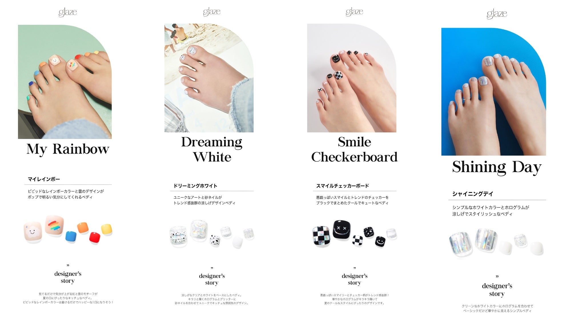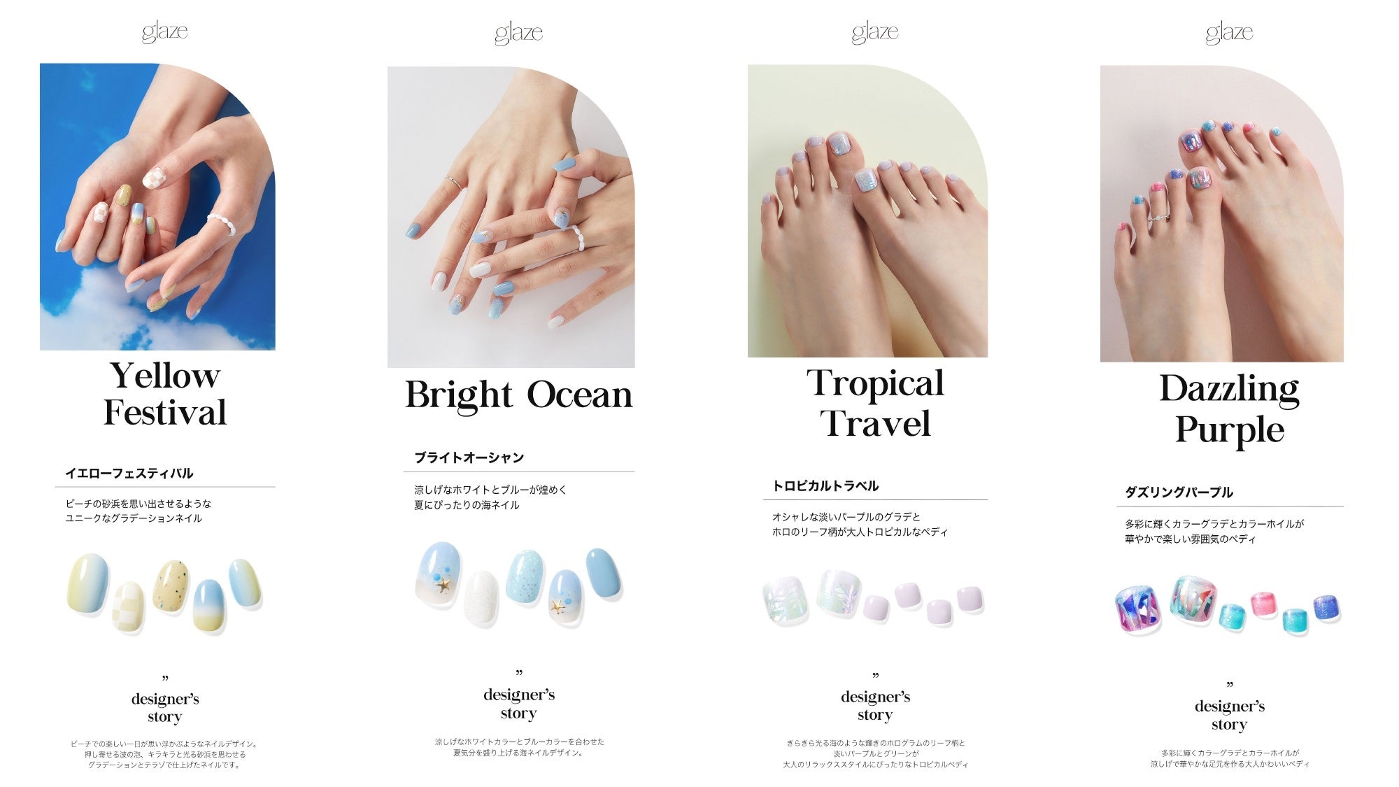 「マグネットネイル」他、公式先行発売にて20種ほど「Glaze」よりこの夏にぴったりな新しいデザインが新登場し、ビーチを思い出させるかのような明るく、また涼しげなデザインや、ペディだからこそ挑戦しやすいPOPで華やかなデザインなど取り揃えております。