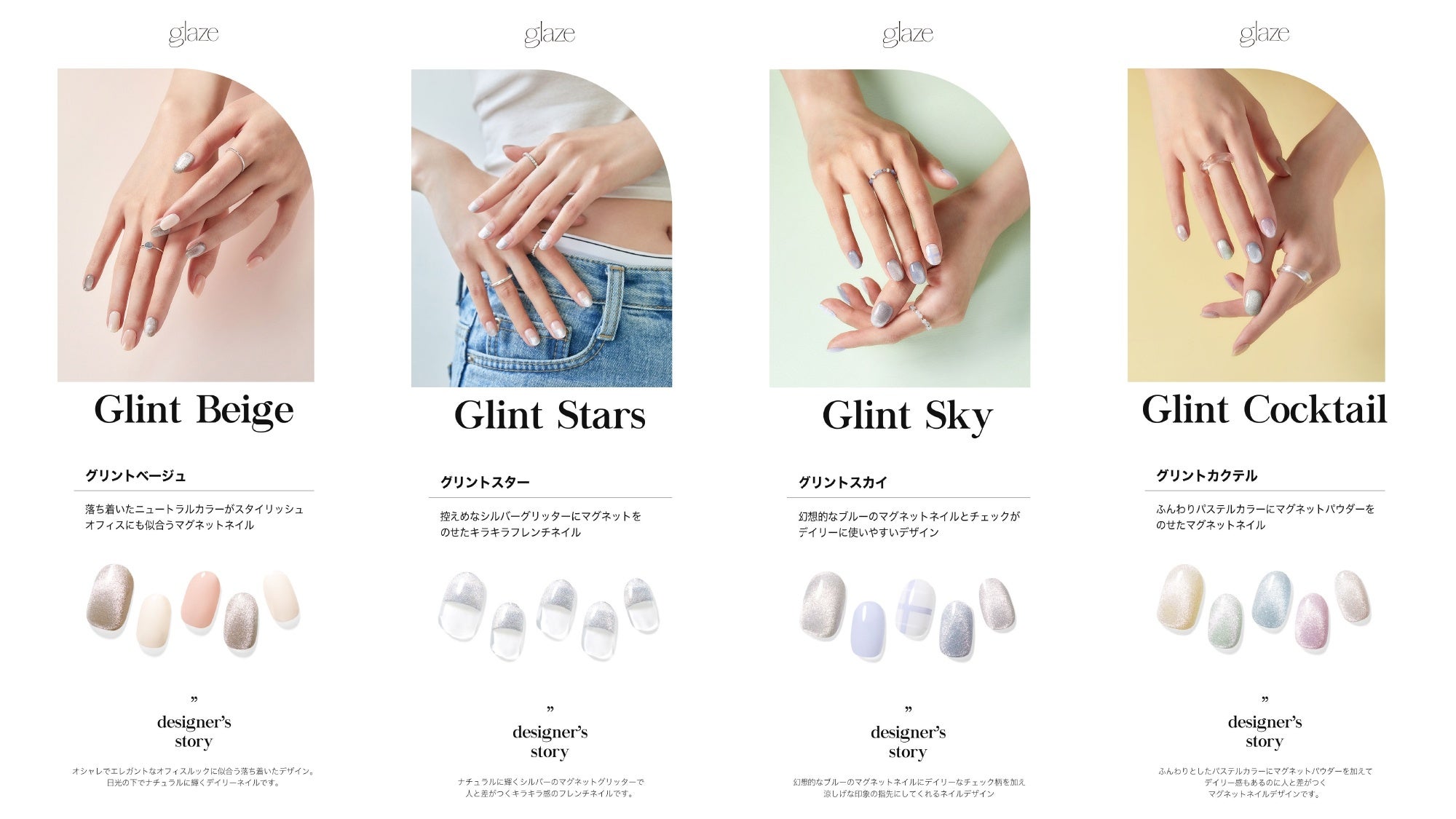 これらはダッシングディバの硬化型プレミアムセミキュアジェルネイルブランド「Glaze」より韓国を皮切りに日本で本日より発売、また簡単に貼れる1秒ジェルネイルチップ「MAGIC PRESS」からも販売を秋に予定しておりますので、両ブランドで「マグネットネイル」をお楽しみいただけます。