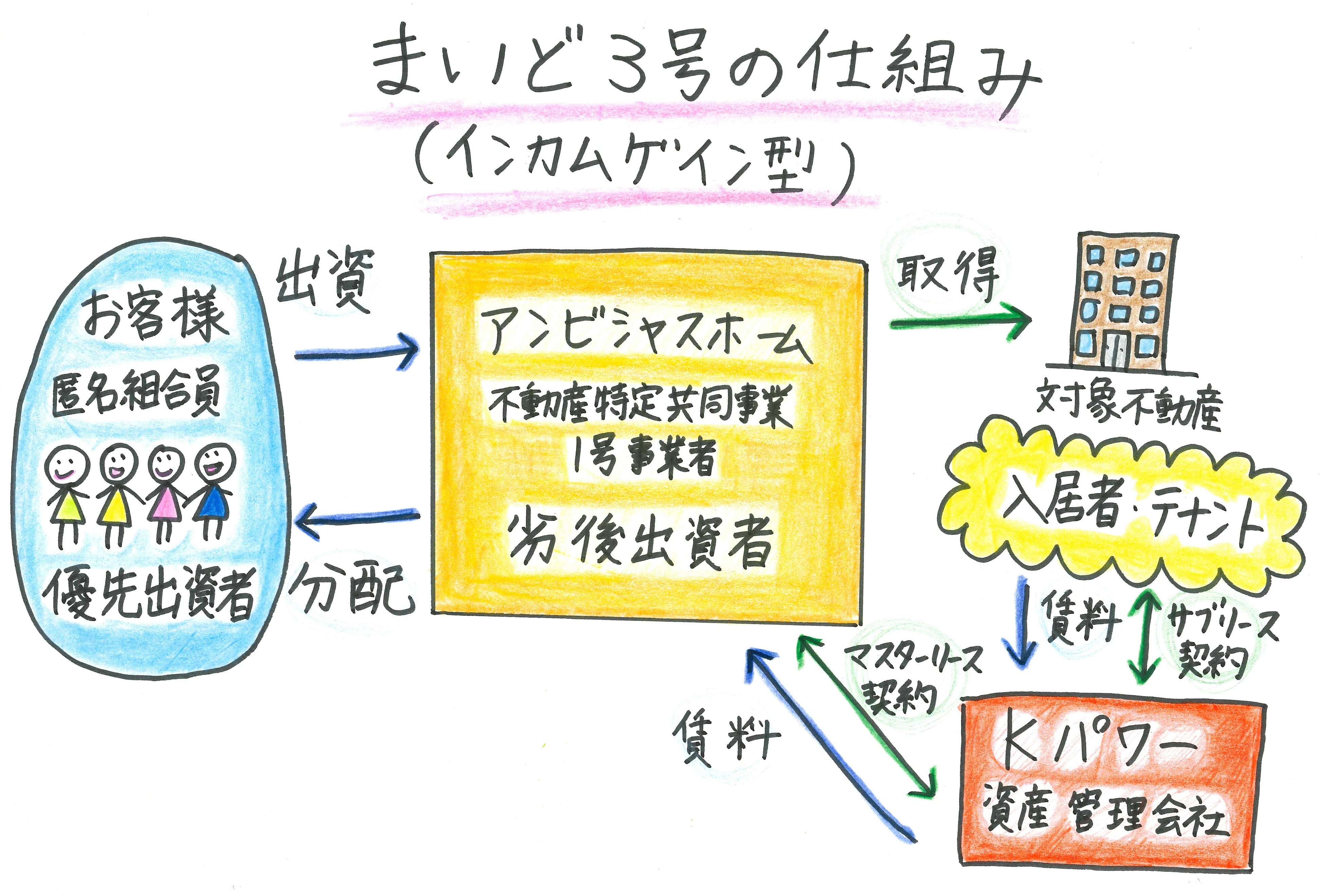 今回のまいど3号も、賃料収入を原資にご出資割合に応じて利益を還元するインカムゲイン型。