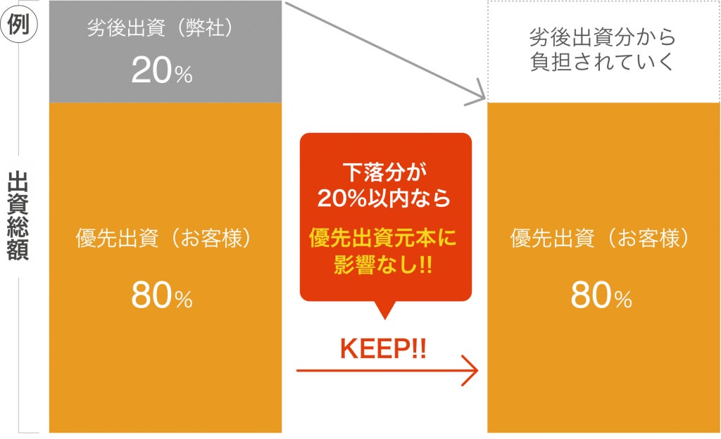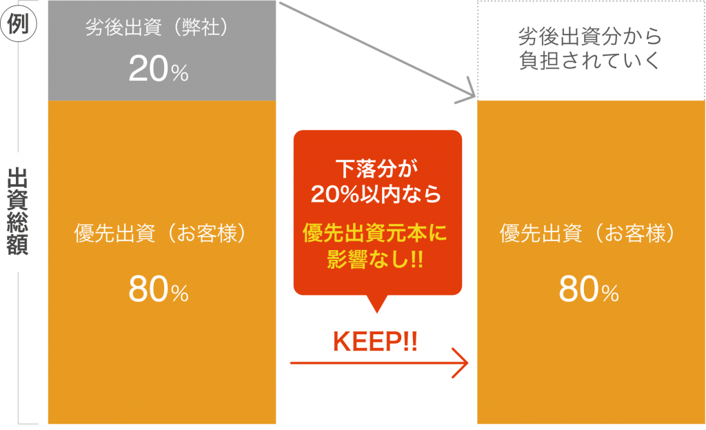 ※劣後出資分でカバーできなかった場合に、優先出資者も損失を負うことになるので元本保証ではありません。(出資法により元本の保証は禁じられています。)