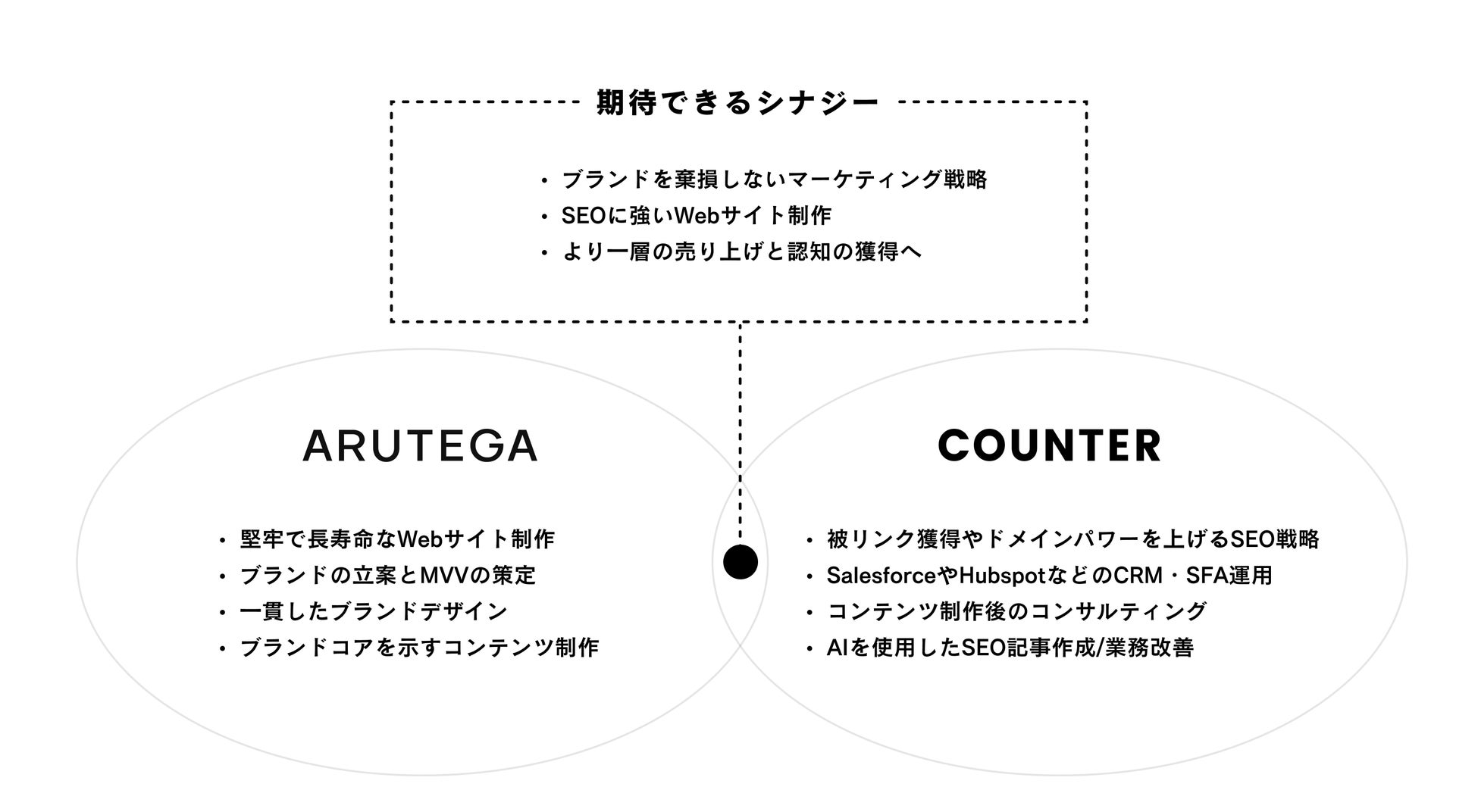 今回の業務提携は、当社ARUTEGAのブランドデザイン領域にて、COUNTER株式会社のデジタルマーケティング領域の強みを活かすことができます。その結果、顧客にもたらす成果を倍増させることが可能となります。