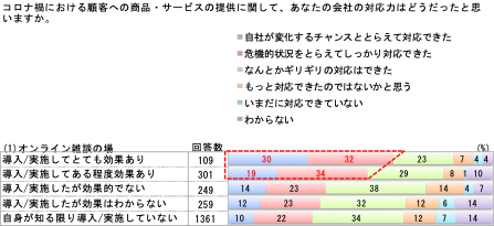 コロナ禍に「対応できた」企業ほど、(1)ウェブ会議システムを使用する割合が高く、効果も出せている。なかでも「自社が変化するチャンスとしてとらえて対応できた」企業の約4割が「とても」効果を出せている。一方、コロナ禍に「いまだに対応できていない」企業の約3割は未導入である。
