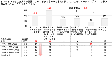 コロナ禍収束期のミーティング開催方法は「職場で対面」の意向が合計35%「そのつどオンライン/リアルを判断」が30%で拮抗
