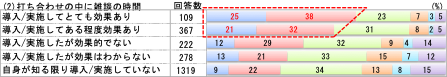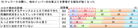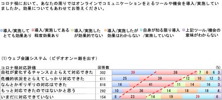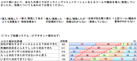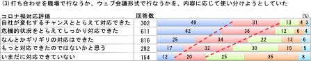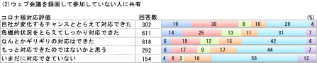 ウェブ会議システム自体の導入率や効果には及ばないが、(2)会議を録画して共有する動きもコロナ禍対応評価と比例関係にあることがわかった。