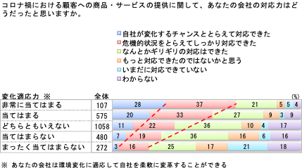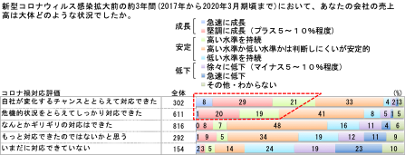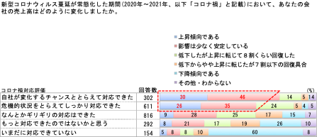 このように、コロナ禍以前からの売上状況とコロナ禍での売上変化、コロナ禍対応評価は連関している。災禍になってから急に対応できるようになるわけではなく、以前から変化に対応したり、価値を生み出したりできる組織のダイナミズムをもっていたかどうかが、不測の事態での行動として顕在化したと考えるほうが自然だ。