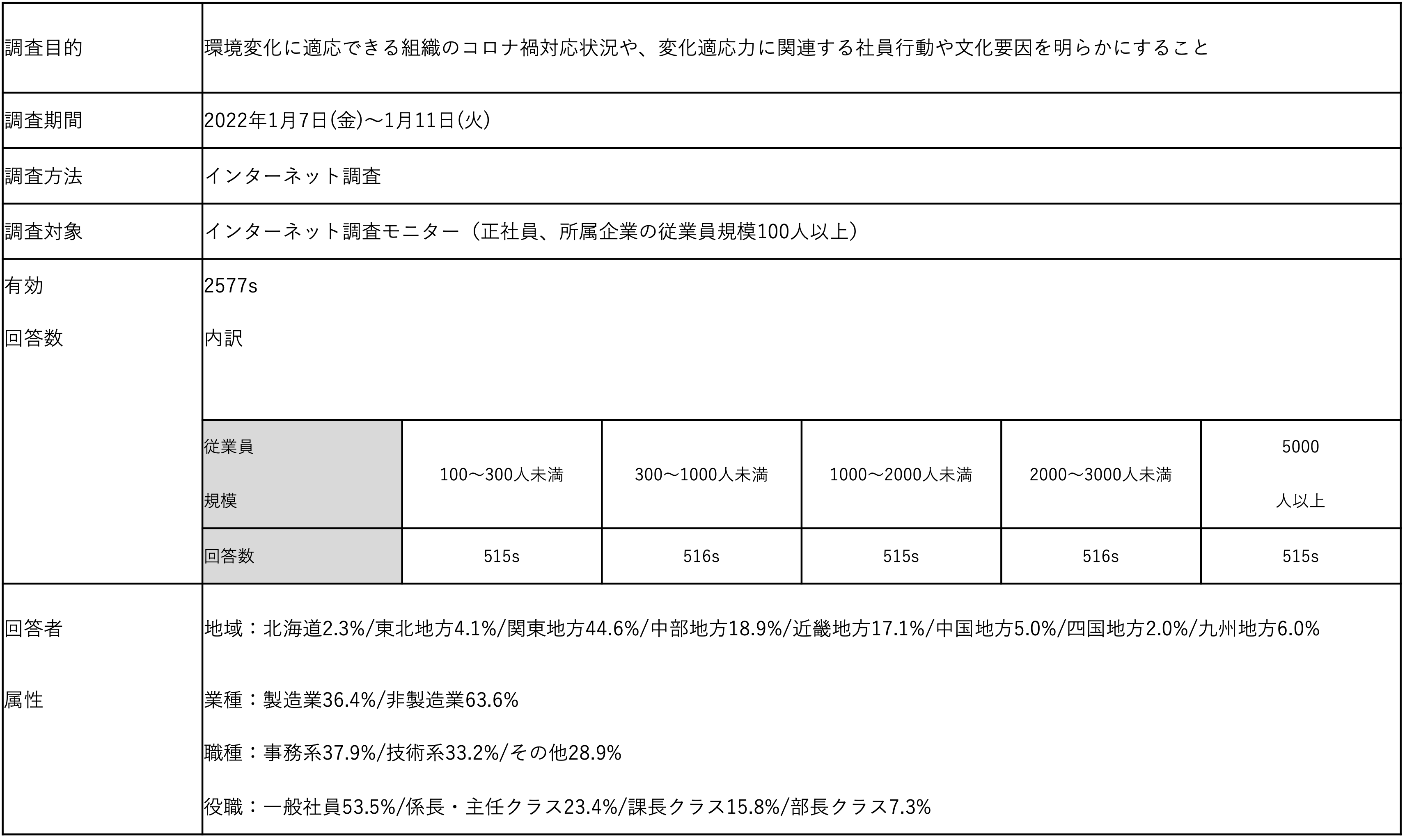 組織の実態や本音の思いを語り合うまじめな雑談「オフサイトミーティング」をベースに組織づくりを支援する株式会社スコラ・コンサルト(本社:東京都品川区、代表取締役:簑原麻穂)は、2022年1月に会社員2577名に対しアンケート調査を実施しました。調査の目的は、環境変化に適応できる組織がコロナ禍にどう対応してきたか、ならびに、変化適応力に関連する社員行動や文化要因を明らかにすることです。今回は第1弾として、コロナ禍の対応力に焦点を当て、社内でとられた行動、ツールの導入状況と効果、今後のミーティング方法を中心に分析結果を報告します。