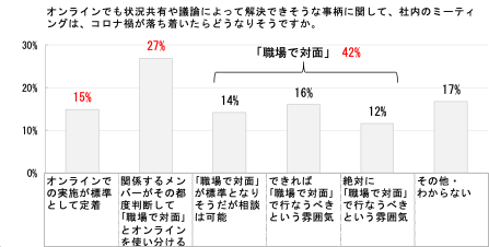 『職場で対面』が標準となりそうと答えた割合は合計42%、「その都度判断」が27%、「オンラインが標準として定着」が15%となる。この結果からは職場回帰が進みそうに見える。