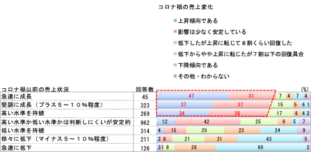 そこで、図⑧⑨の2項目、つまり、新型コロナの渦中とそれ以前の売上傾向をクロス分析したところ(図⑩)、比例的な関係が確認できた。コロナ禍で対応が困難だった業界もあるだろうが、基本的にはコロナ禍以前から堅調に成長していた企業は、コロナ禍中の売上も「上昇傾向」もしくは「影響は少なく安定」していたといえる。