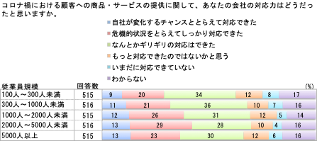 1000~5000人規模の企業で「危機的状況をとらえて対応」が多いなど、企業規模ごとに多少の違いは見られるが、いずれの規模でも「対応できた」から「対応できていない」まで評価が分散している。そこでここから先は、企業規模にとらわれずにコロナ禍での自社の対応力評価を軸に分析していく(「わからない」と回答した402名を除く)。